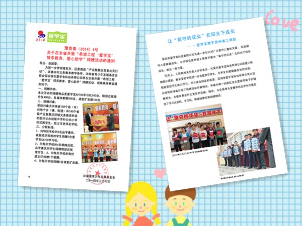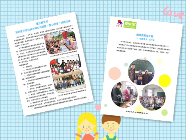 2、2009-2010年爱学宝科技有限公司与重庆秀山县教育局联合推进改善学生学习环境,为留守儿童提供爱心捐赠关同步与辽宁省工商联开展爱心助学活动。