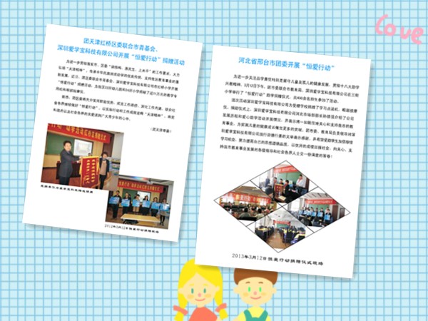 5、2013年爱学宝科技有限公司联合河北刑台、衡水团委举行“恒爱行动”捐赠仪式,为该地区所有初中、小学和幼儿园进行了爱心捐赠。