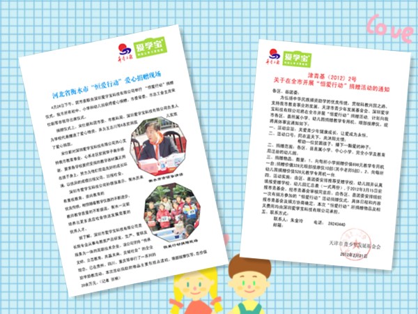 3、2012年爱学宝科技有限公司联合天津青基会,在天津地区开展“恒爱行动”爱心助学活动。