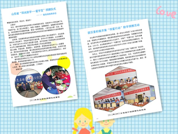 4、2013年爱学宝科技有限公司联合山东省工商联、省总工会开展爱心助学活动,向全省各地区部分学校进行爱心捐赠。